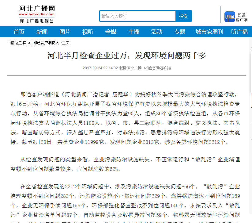河北广播电视台即通客户端:河北半月检查企业过万,发现环境问题两千多