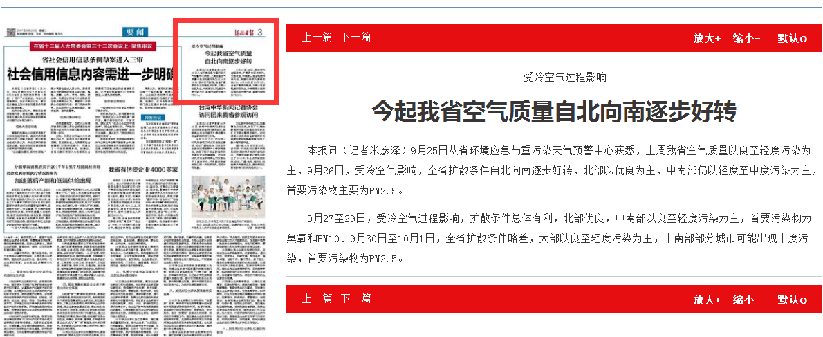 本报讯(记者米彦泽)9月25日从省环境应急与重污染天气预警中心获悉,上周我省空气质量以良至轻度污染为主,9月26日,受冷空气影响,全省扩散条件自北向南逐步好转,北部以优良为主,中南部仍以轻度至中度污染为主,首要污染物主要为PM2.5。