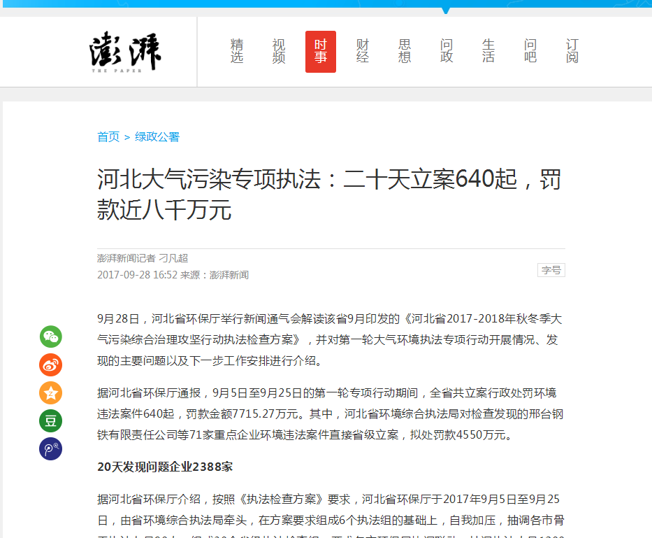 9月28日,河北省环保厅举行新闻通气会解读该省9月印发的《河北省2017-2018年秋冬季大气污染综合治理攻坚行动执法检查方案》,并对第一轮大气环境执法专项行动开展情况、发现的主要问题以及下一步工作安排进行介绍。