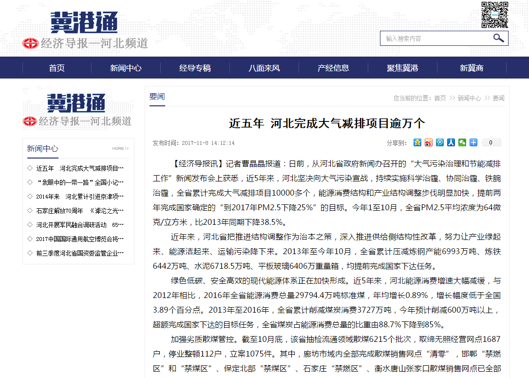 【经济导报讯】记者曹晶晶报道:日前,从河北省政府新闻办召开的“大气污染治理和节能减排工作”新闻发布会上获悉,近5年来,河北坚决向大气污染宣战,持续实施科学治霾、协同治霾、铁腕治霾,全省累计完成大气减排项目10000多个,能源消费结构和产业结构调整步伐明显加快,提前两年完成国家确定的“到2017年PM2.5下降25%”的目标。今年1至10月,全省PM2.5平均浓度为64微克/立方米,比2013年同期下降38.5%。