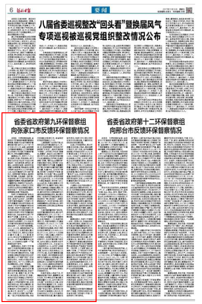 本报讯 为贯彻落实省委、省政府关于环境保护督察的重要决策部署,根据《河北省环境保护督察实施方案(试行)》,2017年7月27日至8月15日,省委、省政府第九环境保护督察组(以下简称督察组)对张家口市开展了环境保护督察工作,并形成督察反馈意见。