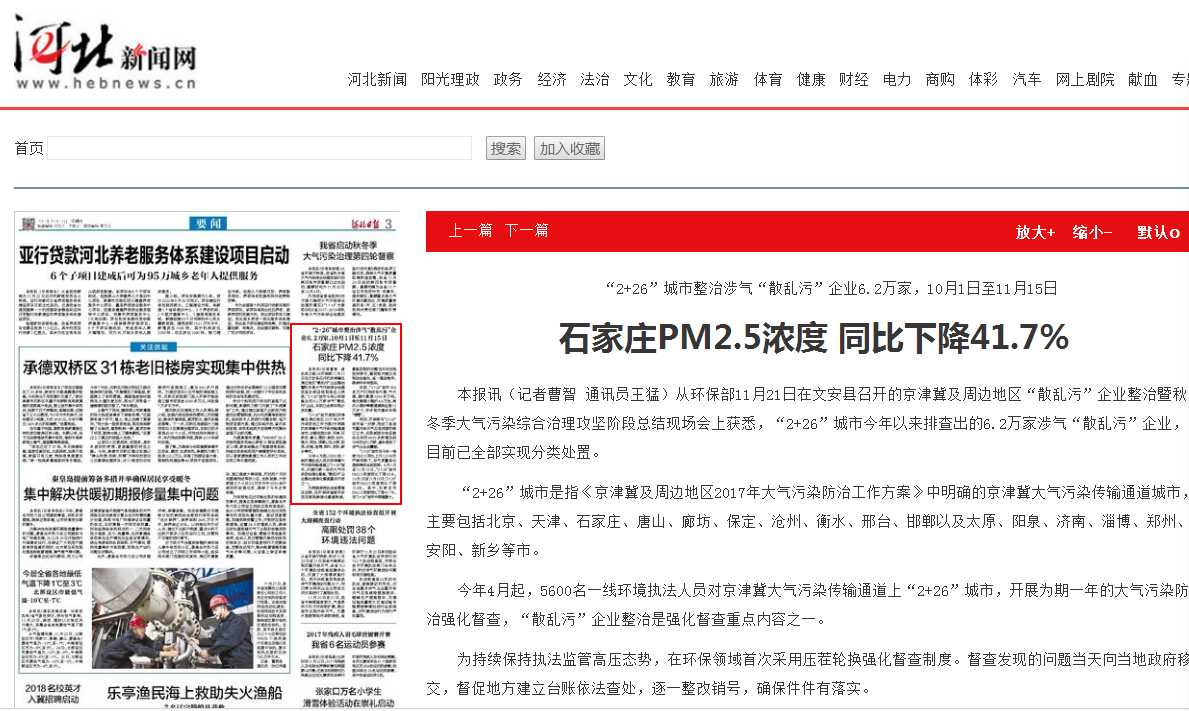 “2+26”城市在今年一季度PM2.5同比上升12.5%的严峻形势下,空气质量恶化趋势得到全面扭转。4月1日至11月15日,“2+26”城市PM2.5浓度同比下降6.5%。10月1日至11月15日,“2+26”城市PM2.5浓度同比下降15.8%。其中,石家庄市PM2.5浓度同比下降41.7%,在“2+26”城市中降幅最大。