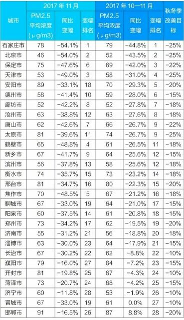 《通报》对“2+26”城市2017年秋冬季以来细颗粒物(PM2.5)改善情况进行排名。