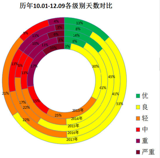 同时,2013年以来每年10月1日至12月9日重度污染和严重污染的天数中,2013年占比为27%,为近5年来最高;今年占比最低,为4%。