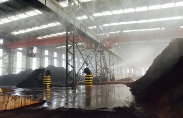 河北永洋特钢集团料棚内的喷洒除尘装置正在作业。澎湃新闻记者 李珣 摄