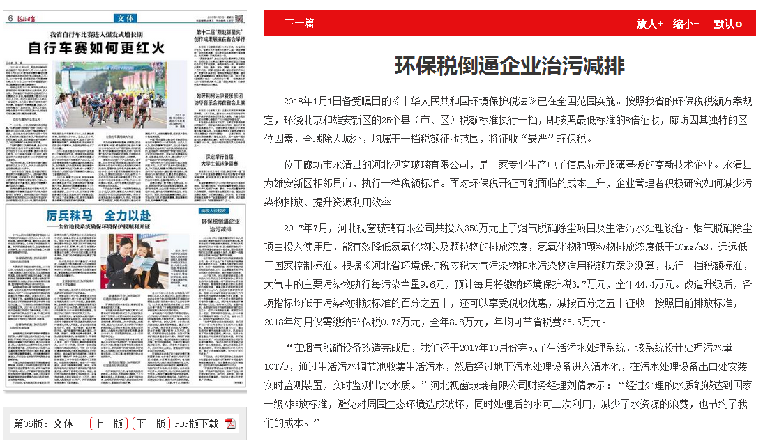 位于廊坊市永清县的河北视窗玻璃有限公司,是一家专业生产电子信息显示超薄基板的高新技术企业。永清县为雄安新区相邻县市,执行一档税额标准。面对环保税开征可能面临的成本上升,企业管理者积极研究如何减少污染物排放、提升资源利用效率。