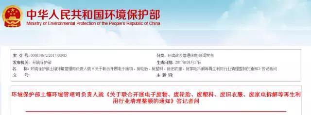 环境保护部:环保部土壤环境管理司负责人就《关于联合开展电子废物、废轮胎、废塑料、废旧衣服、废家电拆解等再生利用行业清理整顿的通知》答记者问