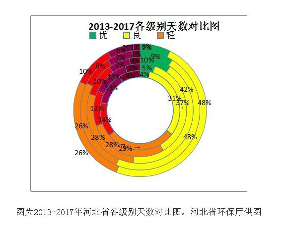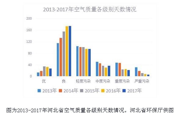 2017年,河北省空气质量平均达标天数202天,占全年总天数的55.3%,较2013年增加73天。入冬以来,河北省空气质量改善幅度一直领跑全国。