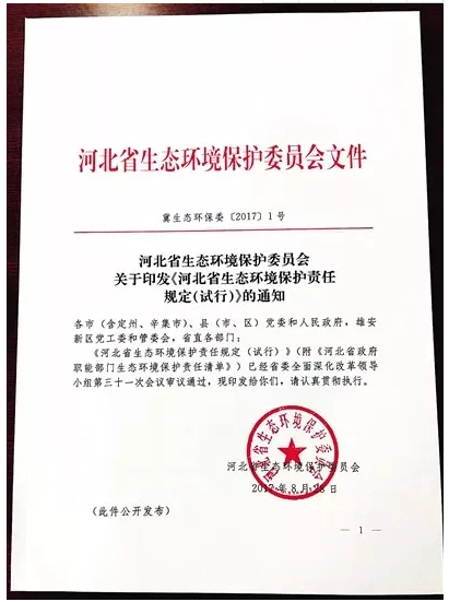 2017年8月28日,河北省生态环境保护委员会印发了《河北省生态环境保护责任规定(试行)》(冀生态环保委﹝2017﹞1号),明确了党委及其有关部门、政府及其有关部门、中直驻冀单位、金融机构、人民法院和人民检察院等部门的生态环境保护责任。在制定该规定的基础上,又编制了《河北省政府职能部门生态环境保护责任清单》(以下简称《责任清单》),进一步细化了26个省政府部门的151项环境监管职责,并逐项列出了追责、问责的情形。