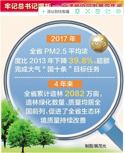 河北新闻网讯(记者段丽茜、曹智)“中国塞罕坝林场建设者”荣获联合国环保最高荣誉“地球卫士奖”;去年第四季度石家庄市空气质量综合指数和PM2.5平均浓度分别同比下降48%、54.8%,在京津冀大气污染传输通道“2+26”城市中降幅排名“双第一”……近年来,河北省建设京津冀生态环境支撑区持续发力,生态环境质量明显改善。2017年,全省PM2.5平均浓度比2013年下降39.8%,超额完成大气“国十条”目标任务;全年完成造林绿化536万亩,年造林面积再创历史新高,全省森林覆盖率提高到33%。