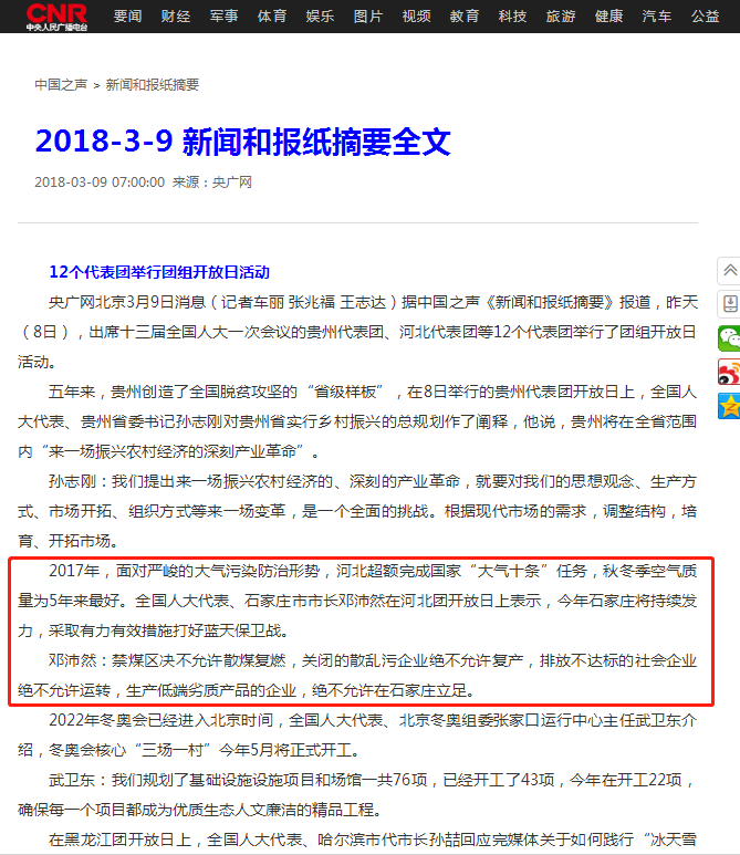 中国之声《新闻和报纸摘要》:面对严峻的大气污染防治形势,河北超额完成国家“大气十条”任务,秋冬季空气质量为5年来最好。 来源:省生态环境宣传教育中心 时间:2018-03-09