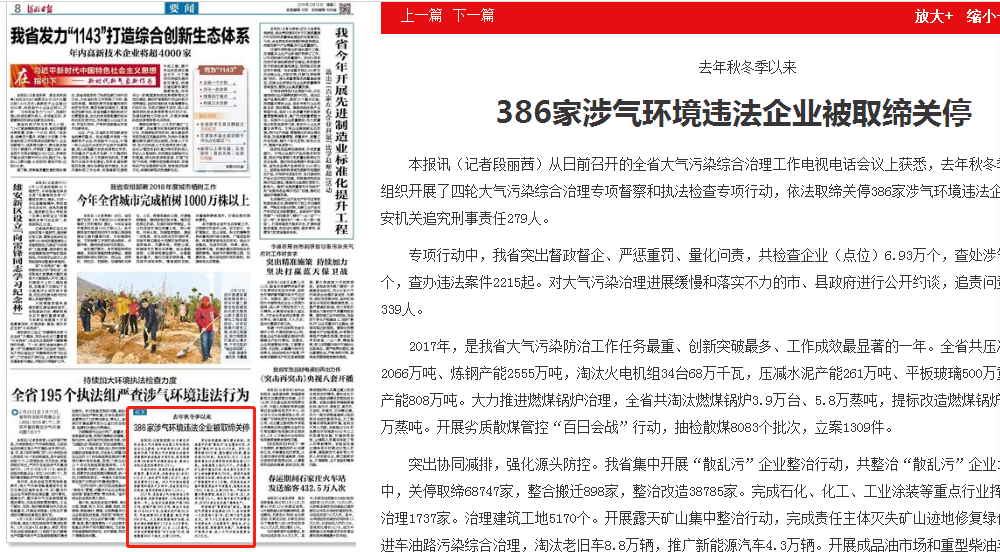 专项行动中,我省突出督政督企、严惩重罚、量化问责,共检查企业(点位)6.93万个,查处涉气问题1.89万个,查办违法案件2215起。对大气污染治理进展缓慢和落实不力的市、县政府进行公开约谈,追责问责相关责任人339人。