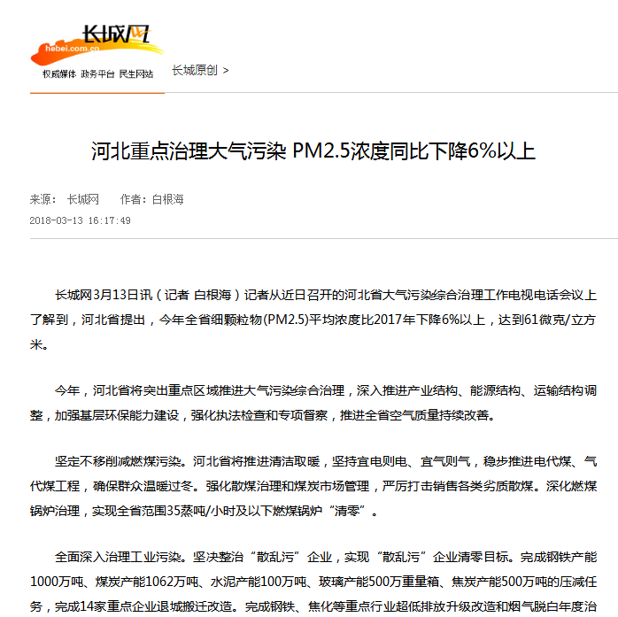 长城网:河北重点治理大气污染 PM2.5浓度同比下降6%以上