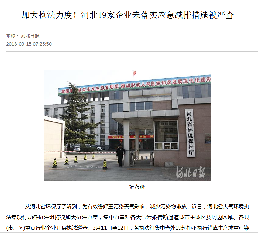 河北日报:加大执法力度!河北19家企业未落实应急减排措施被严查