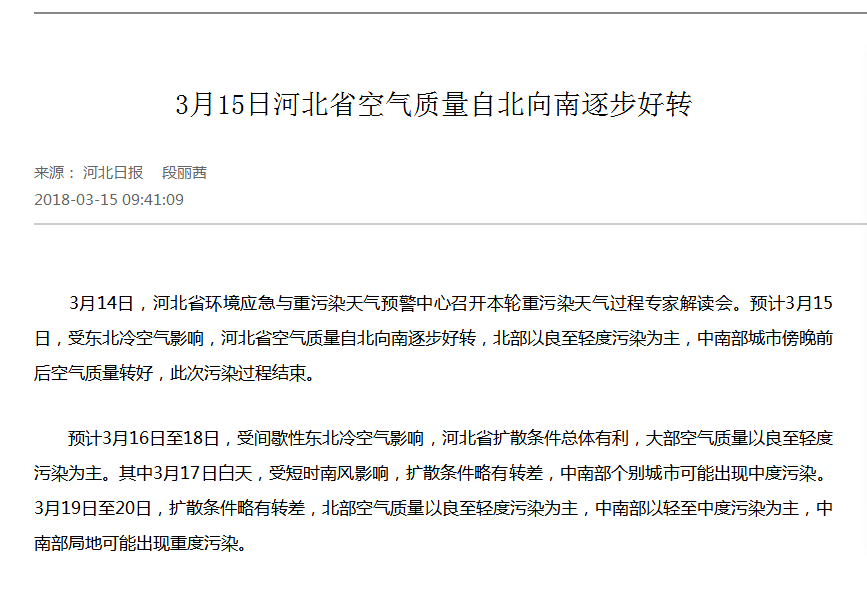 河北日报:3月15日河北省空气质量自北向南逐步好转