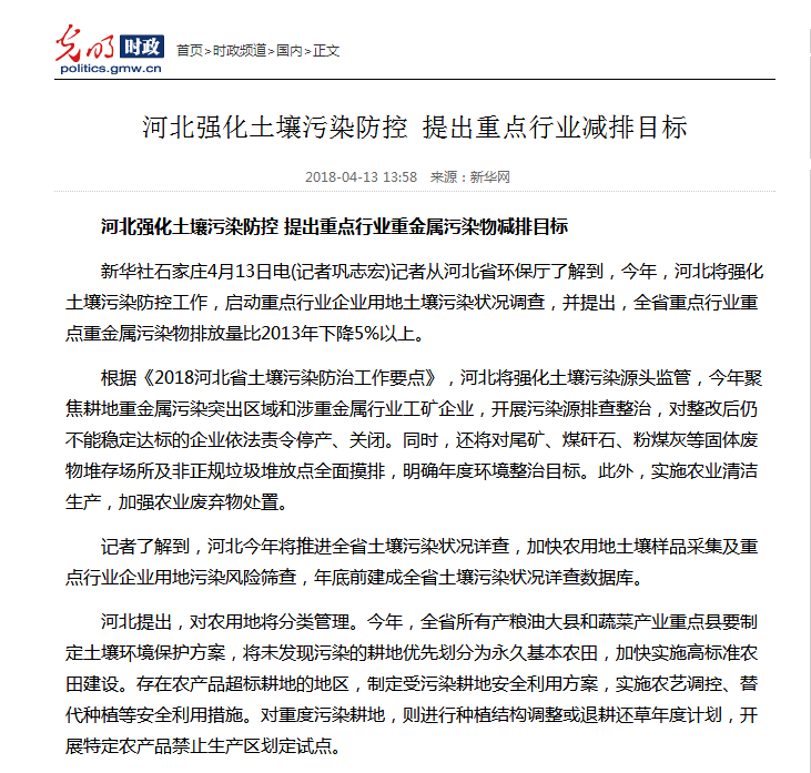 新华社:河北强化土壤污染防控 提出重点行业减排目标