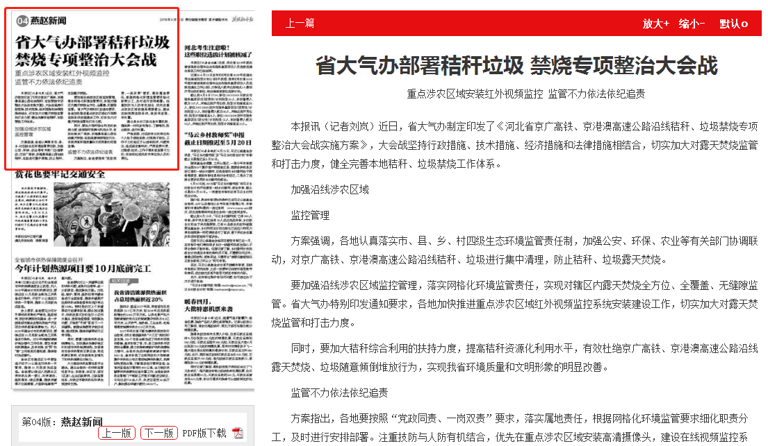 本报讯(记者刘岚)近日,省大气办制定印发了《河北省京广高铁、京港澳高速公路沿线秸秆、垃圾禁烧专项整治大会战实施方案》,大会战坚持行政措施、技术措施、经济措施和法律措施相结合,切实加大对露天焚烧监管和打击力度,健全完善本地秸秆、垃圾禁烧工作体系。