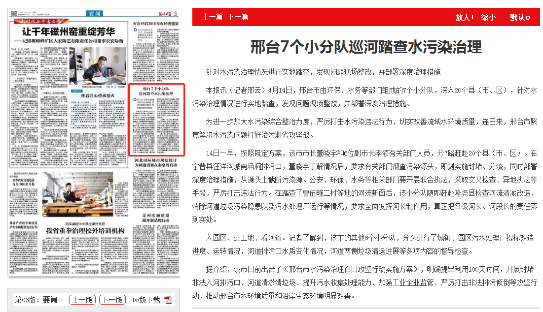 本报讯(记者邢云)4月14日,邢台市由环保、水务等部门组成的7个小分队,深入20个县(市、区),针对水污染治理情况进行实地踏查,发现问题现场整改,并部署深度治理措施。