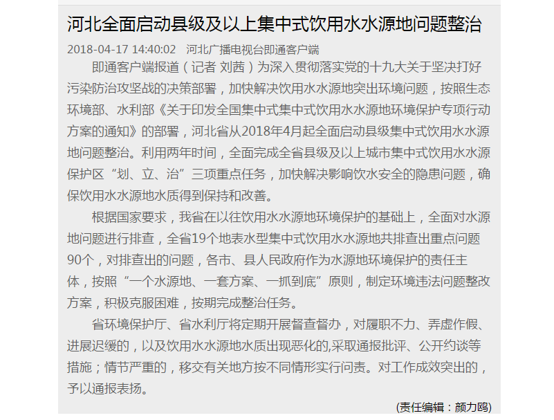 河北广播电视台即通客户端:河北全面启动县级及以上集中式饮用水水源地问题整治
