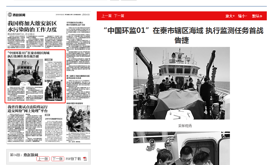 燕赵都市报:“中国环监01”在秦市辖区海域 执行监测任务首战告捷