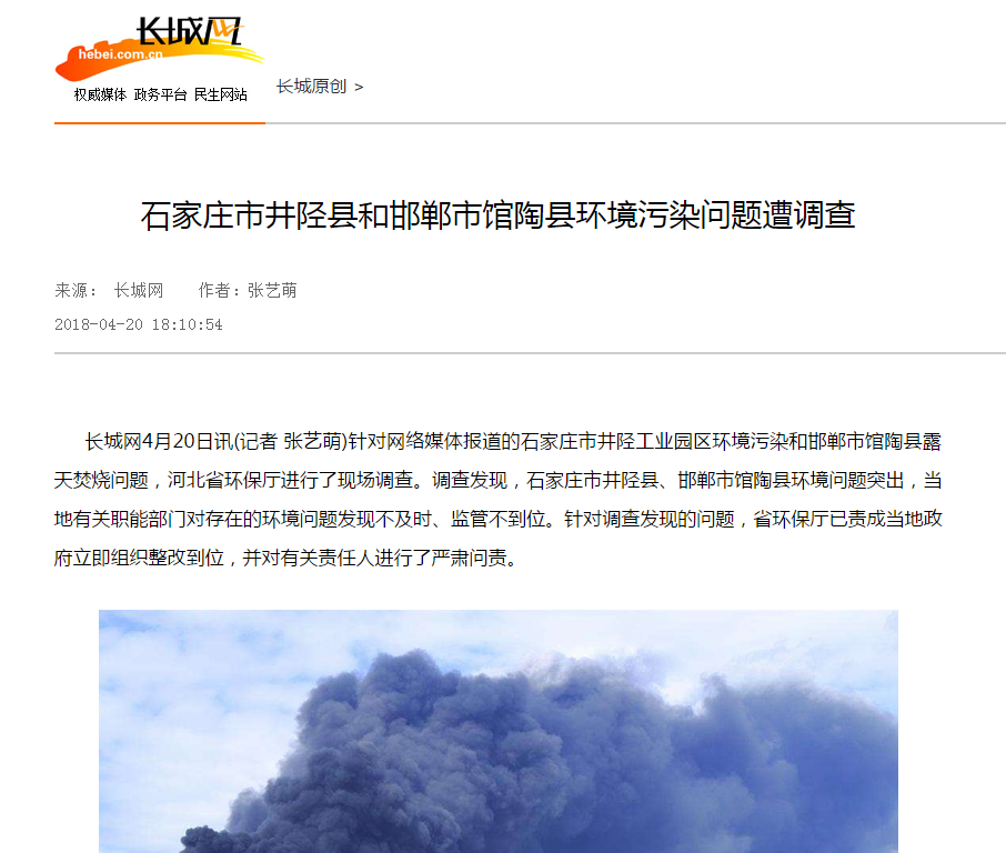 长城网4月20日讯(记者 张艺萌)针对网络媒体报道的石家庄市井陉工业园区环境污染和邯郸市馆陶县露天焚烧问题,河北省环保厅进行了现场调查。调查发现,石家庄市井陉县、邯郸市馆陶县环境问题突出,当地有关职能部门对存在的环境问题发现不及时、监管不到位。针对调查发现的问题,省环保厅已责成当地政府立即组织整改到位,并对有关责任人进行了严肃问责。