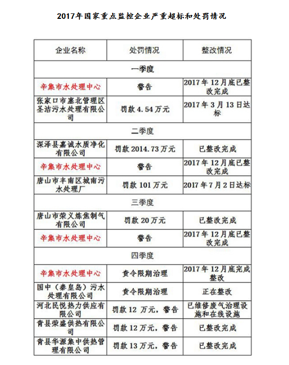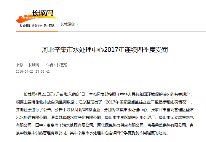 长城网 :河北辛集市水处理中心2017年连续四季度受罚