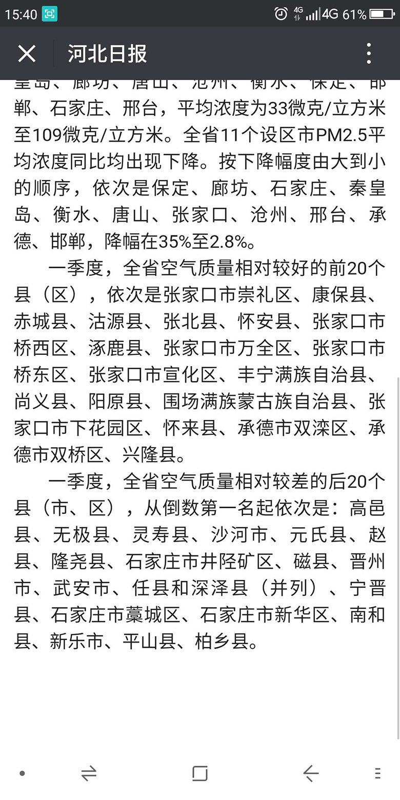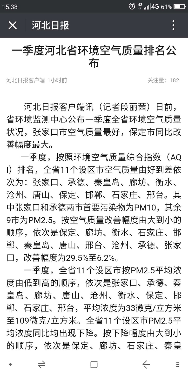 河北日报客户端:一季度河北省环境空气质量排名公布