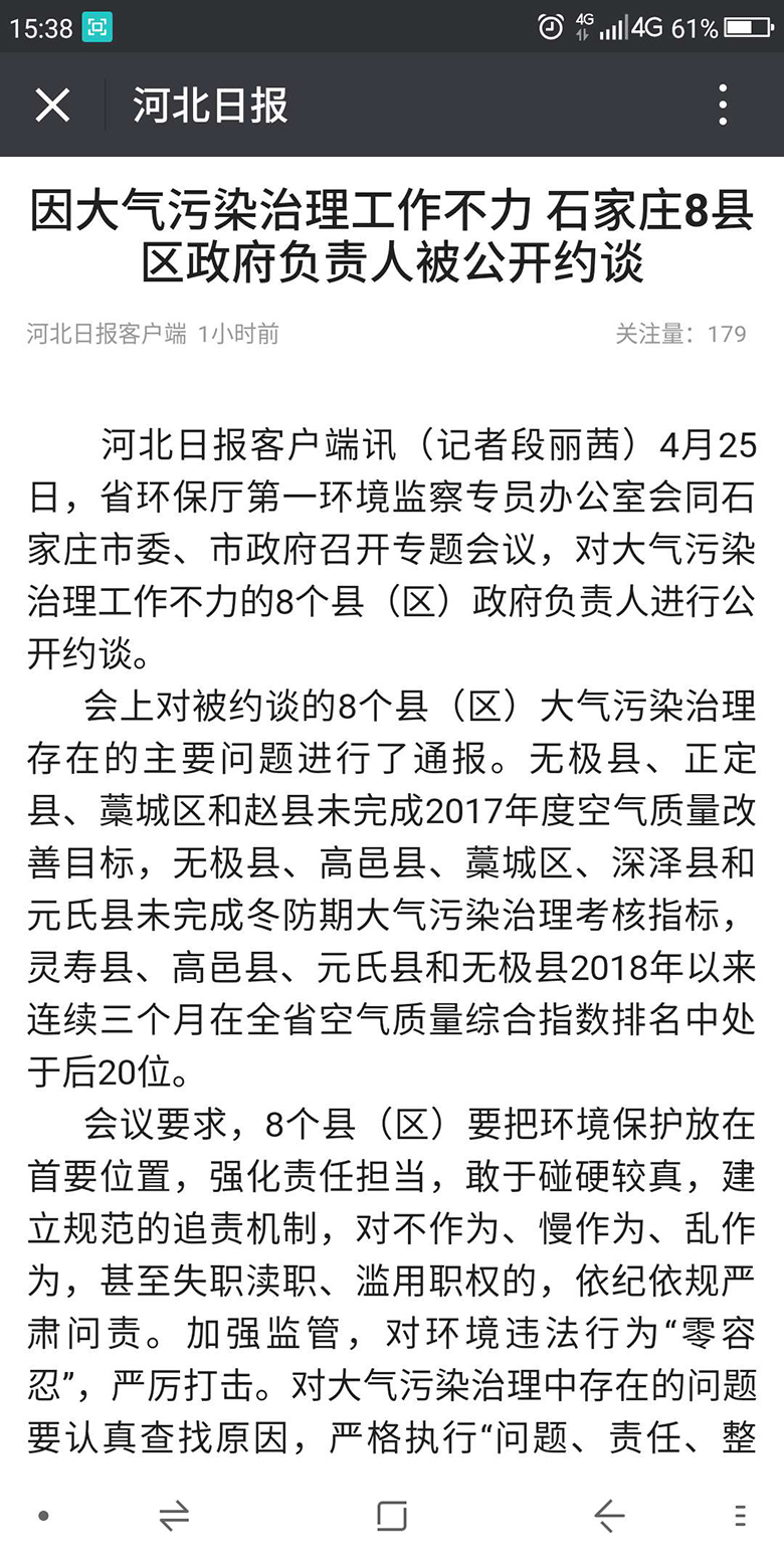 河北日报客户端:因大气污染治理工作不力 石家庄8县区政府负责人被公开约谈