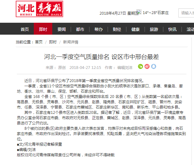 河北青年报:河北一季度空气质量排名 设区市中邢台最差