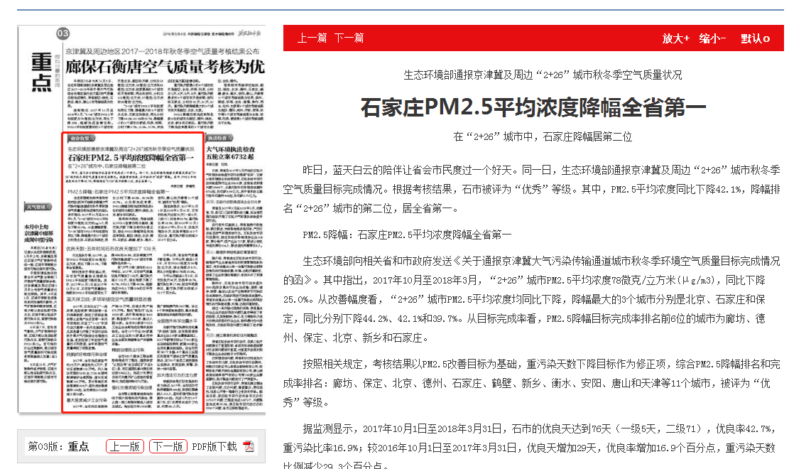 燕赵都市报:石家庄PM2.5平均浓度降幅全省第一