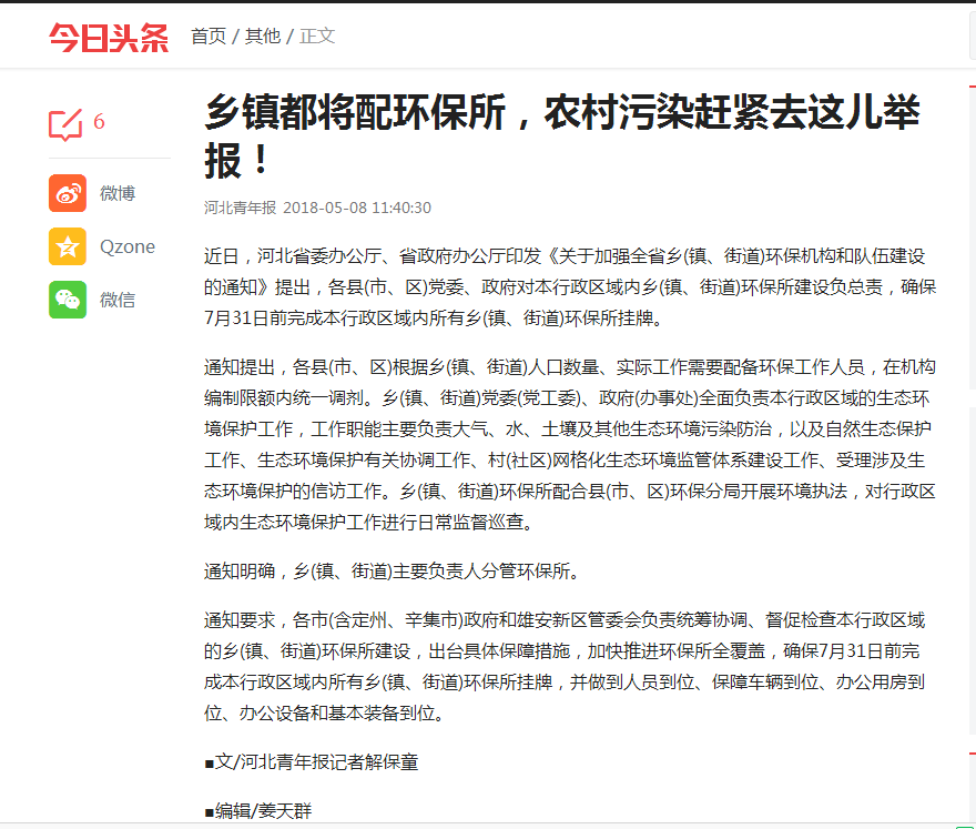 河北青年报新媒体:乡镇都将配环保所,农村污染赶紧去这儿举报!