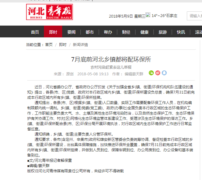 近日,河北省委办公厅、省政府办公厅印发《关于加强全省乡(镇、街道)环保机构和队伍建设的通知》提出,各县(市、区)党委、政府对本行政区域内乡(镇、街道)环保所建设负总责,确保7月31日前完成本行政区域内所有乡(镇、街道)环保所挂牌。
