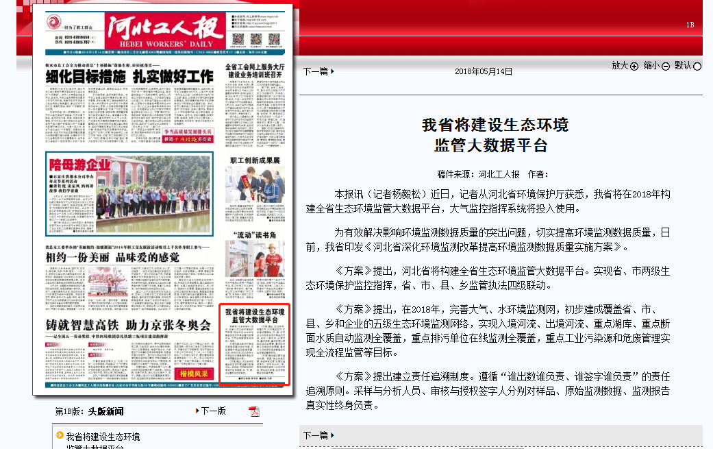 《方案》提出,河北省将构建全省生态环境监管大数据平台。实现省、市两级生态环境保护监控指挥,省、市、县、乡监管执法四级联动。