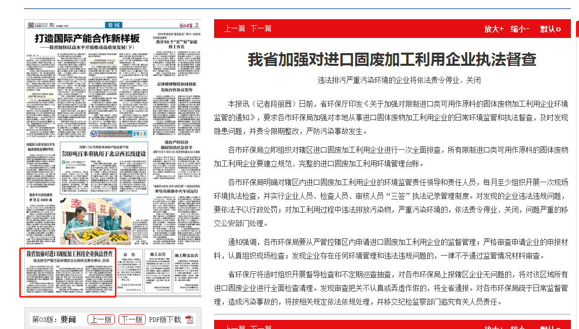 河北日报:我省加强对进口固废加工利用企业执法督查