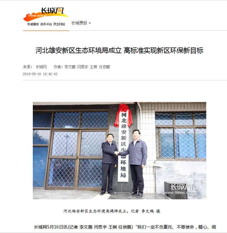 长城网:河北雄安新区生态环境局成立 高标准实现新区环保新目标