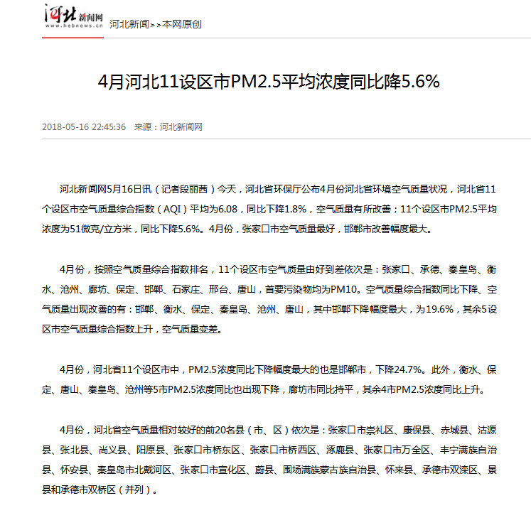 4月份,河北省11个设区市中,PM2.5浓度同比下降幅度最大的也是邯郸市,下降24.7%。此外,衡水、保定、唐山、秦皇岛、沧州等5市PM2.5浓度同比也出现下降,廊坊市同比持平,其余4市PM2.5浓度同比上升。