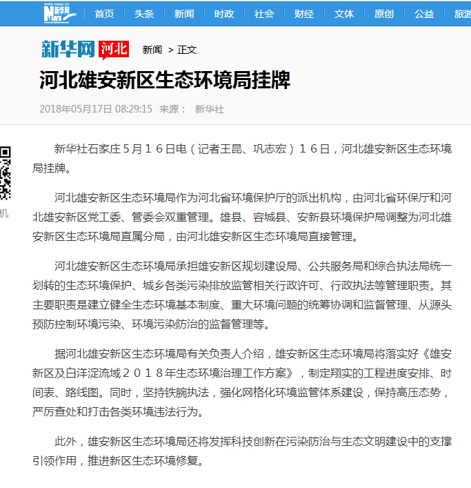 新华社石家庄5月16日电(记者王昆、巩志宏)16日,河北雄安新区生态环境局挂牌。