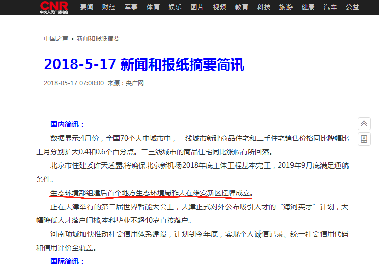 中国之声《2018-5-17 新闻和报纸摘要》:简讯 杏彩组建后首个地方生态环境局昨天在雄安新区挂牌成立。
