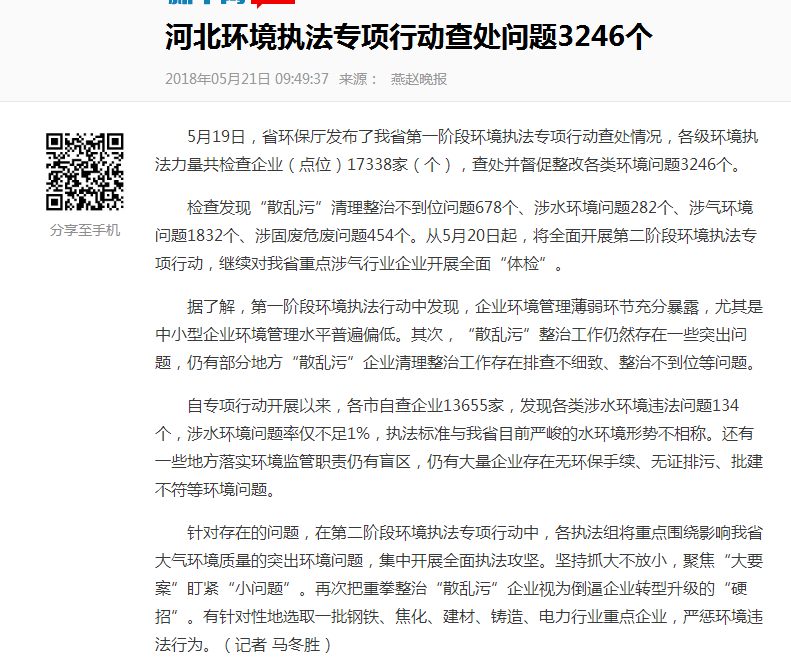 5月19日,省环保厅发布了我省第一阶段环境执法专项行动查处情况,各级环境执法力量共检查企业(点位)17338家(个),查处并督促整改各类环境问题3246个。