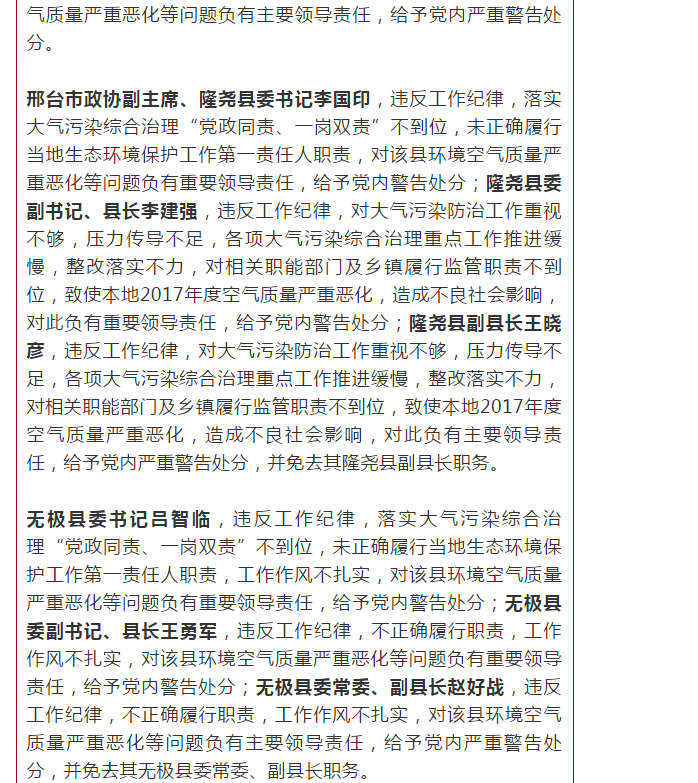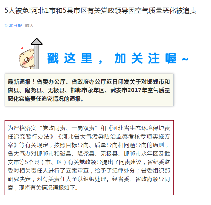 河北日报新媒体:5人被免!河北1市和5县市区有关党政领导因空气质量恶化被追责