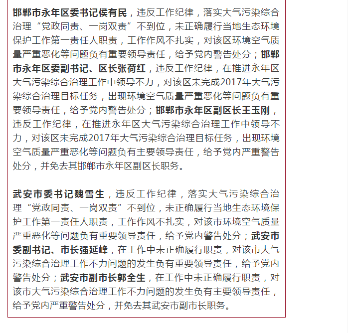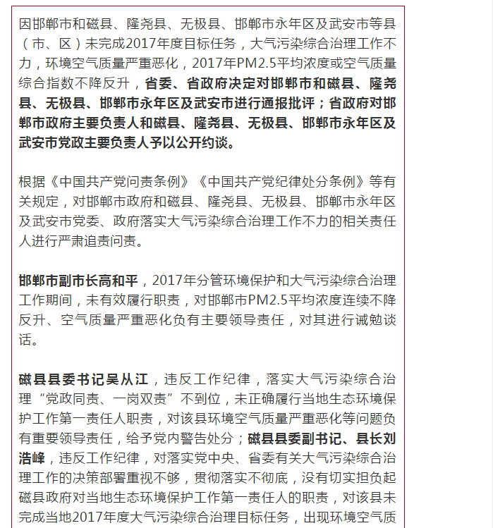 燕赵都市报:因2017年当地空气质量恶化 对邯郸市和5县市区有关责任人实施责任追究