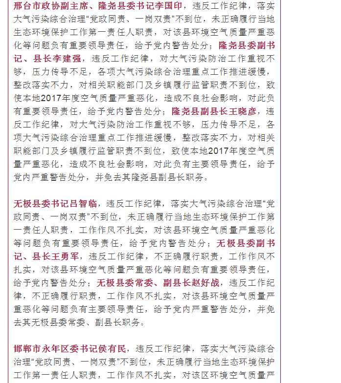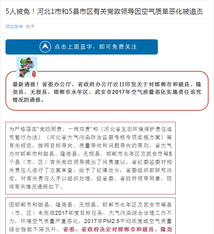河北日报新媒体:5人被免!河北1市和5县市区有关党政领导因空气质量恶化被追责