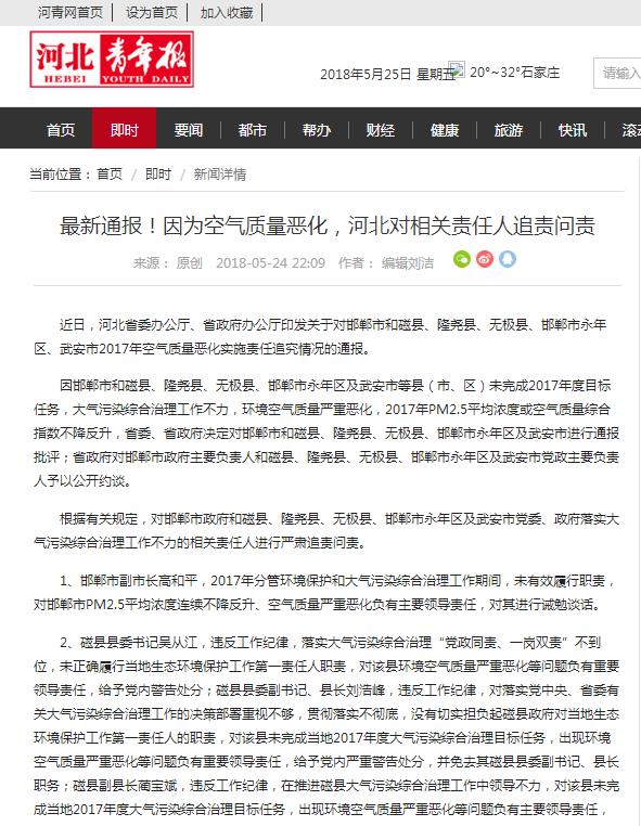 河北青年报:最新通报!因为空气质量恶化,河北对相关责任人追责问责