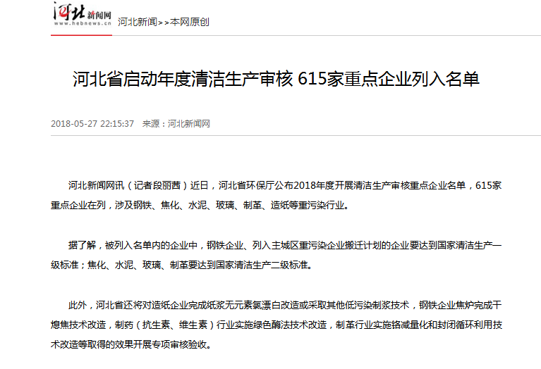 河北新闻网:河北省启动年度清洁生产审核 615家重点企业列入名单