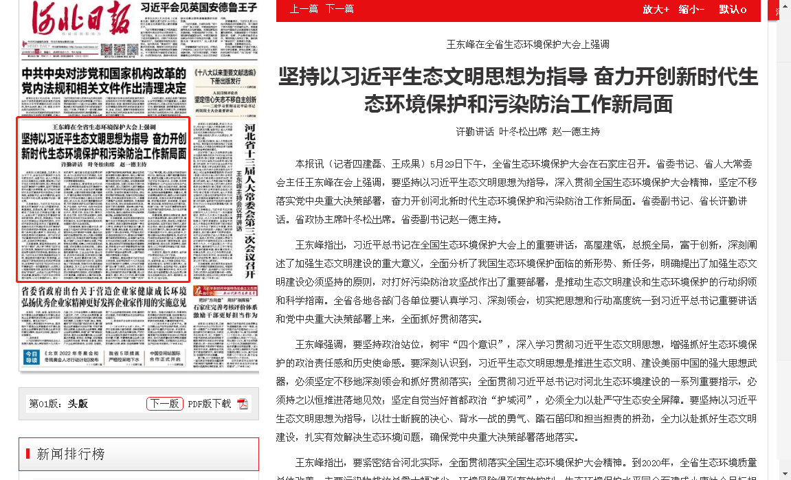 河北日报: 王东峰在全省生态环境保护大会上强调 坚持以习近平生态文明思想为指导 奋力开创新时代生态环境保护和污染防治工作新局面