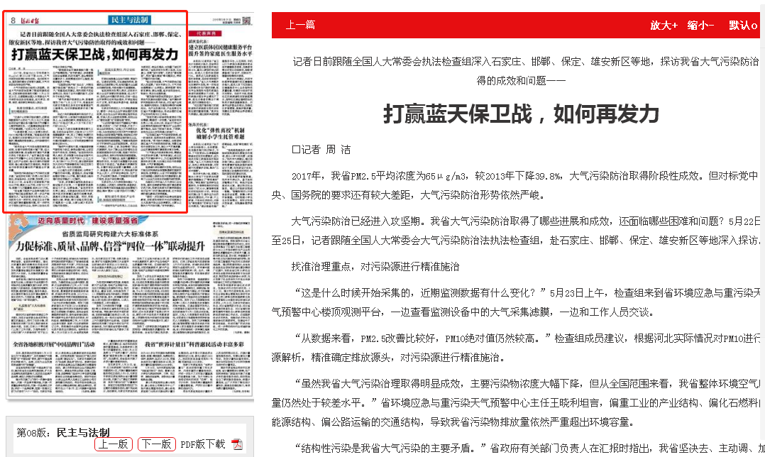 大气污染防治已经进入攻坚期。我省大气污染防治取得了哪些进展和成效,还面临哪些困难和问题?5月22日至25日,记者跟随全国人大常委会大气污染防治法执法检查组,赴石家庄、邯郸、保定、雄安新区等地深入探访。