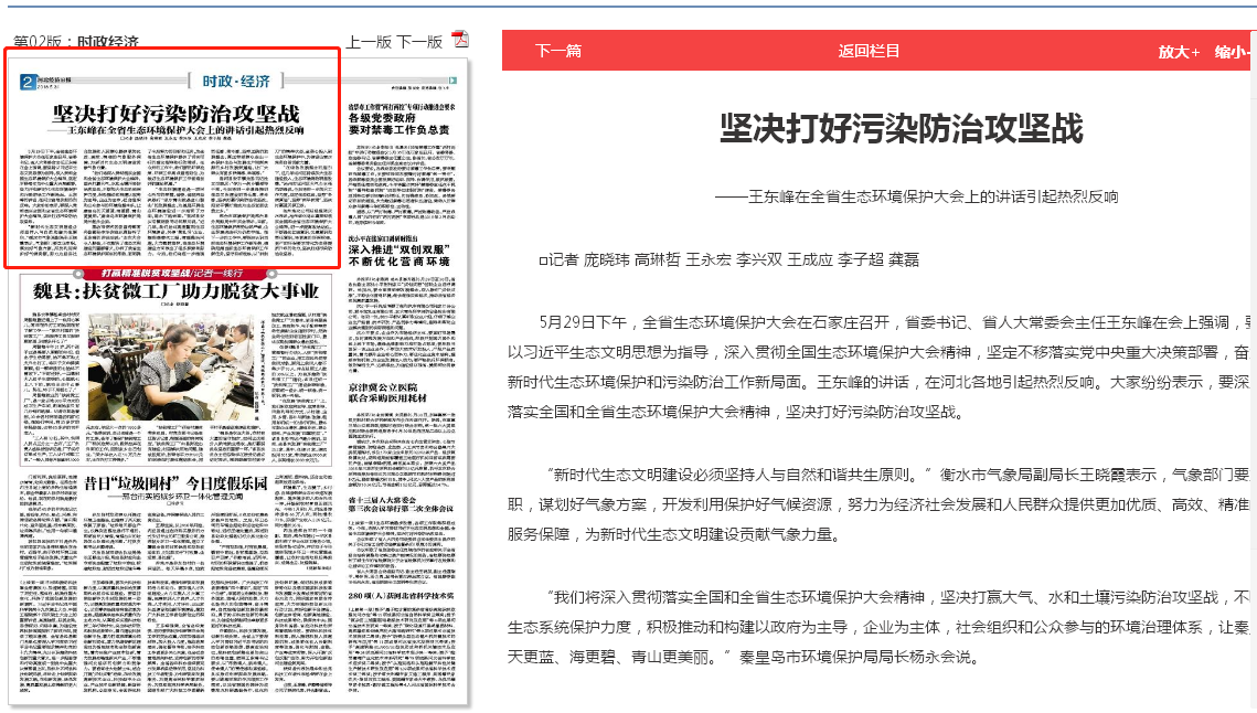 5月29日下午,全省生态环境保护大会在石家庄召开,省委书记、省人大常委会主任王东峰在会上强调,要坚持以习近平生态文明思想为指导,深入贯彻全国生态环境保护大会精神,坚定不移落实党中央重大决策部署,奋力开创新时代生态环境保护和污染防治工作新局面。王东峰的讲话,在河北各地引起热烈反响。大家纷纷表示,要深入贯彻落实全国和全省生态环境保护大会精神,坚决打好污染防治攻坚战。