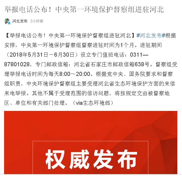 河北发布(微博):举报电话公布!中央第一环境保护督察组进驻河北