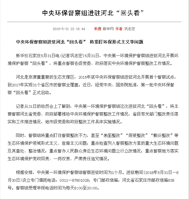 新华社:中央环保督察组进驻河北“回头看” 将紧盯环保形式主义等问题