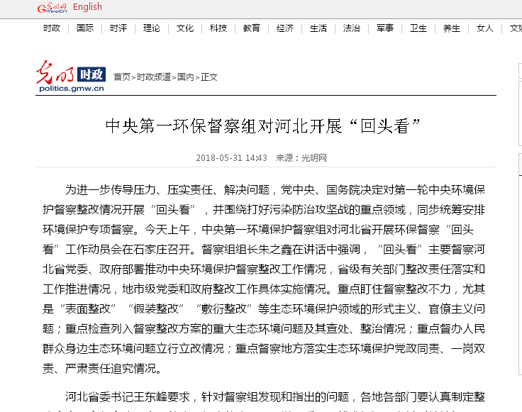 光明网:中央第一环保督察组对河北开展“回头看”